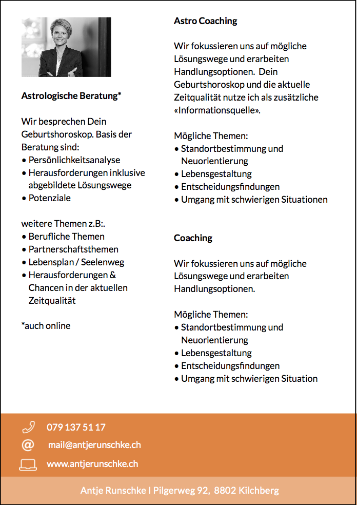 Bitte beachte, dass dies keine astrologische Beratung ist, sondern ich die Astrologie als unterstützendes Tool für Dein Coaching nutze.